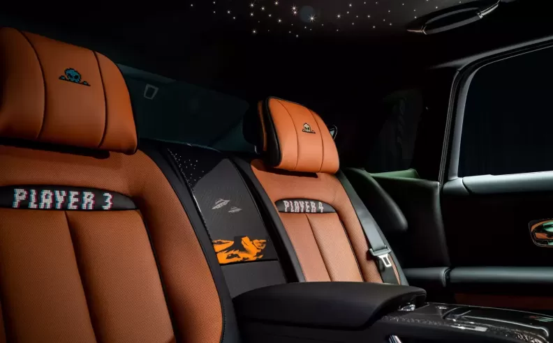 Rolls-Royce reengineered the famed Starlight headliner into “Pixel Blaster,” with fiber-optic lights mimicking 8-bit battle cruisers firing laser blasts, a fresh take that appeals to younger luxury clientele who grew up gaming. Door sills light with pixelated phrases such as “Press Start,” “Insert Coin,” “Level Up,” and “Loading…” reinforcing the arcade theme in an immersive yet tasteful manner. The dashboard bears a reimagined “Ghost” badge resembling a pixelated gunship, merging heritage and digital-age aesthetics harmoniously, a feature likely admired among UAE collectors who cherish symbolic design and individuality.